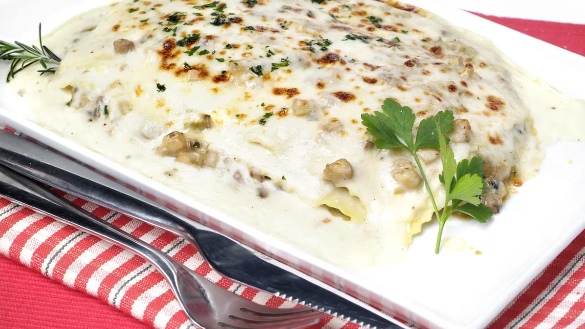 Receta de lasaña de champiñones. Plato de pasta, lasaña rellena de champiñones con mozzarella y gratinada con bechamel elaborada por Bruno Oteiza.