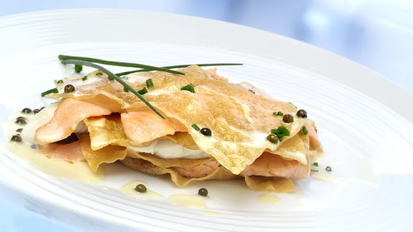 Lasaña frita de salmón rojo y lenguado
