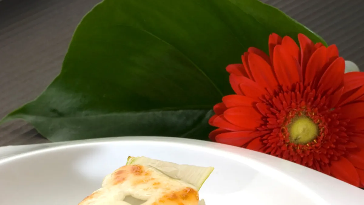 Receta de falsa lasaña con pencas de acelga rellenas de carne y acompañadas de una salsa de pimientos del piquillo.
