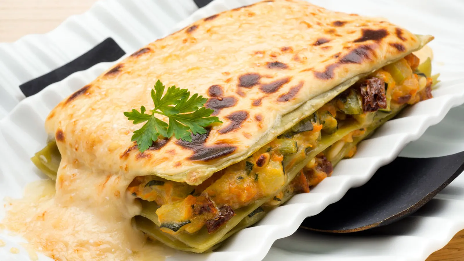 Receta de Karlos Arguiñano de lasaña verde de hortalizas (calabaza, calabacín, tomates secos, cebolla), piñones y albahaca. Un plato clásico de la cocina italiana.