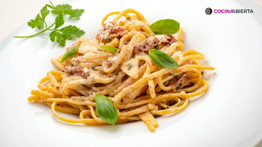 Para preparar esta pasta, también conocida como linguini, linguine o tallarines en España, solo necesitas hacer la crema en una tartera con mantequilla, ajo en láminas, lonchas de bacon, tomates deshidratados y queso crema. Luego, agrega caldo de pollo y, cuando comience a hervir, incorpora la pasta. Deja que se cocine y sirve con queso parmesano rallado y hojas de albahaca.