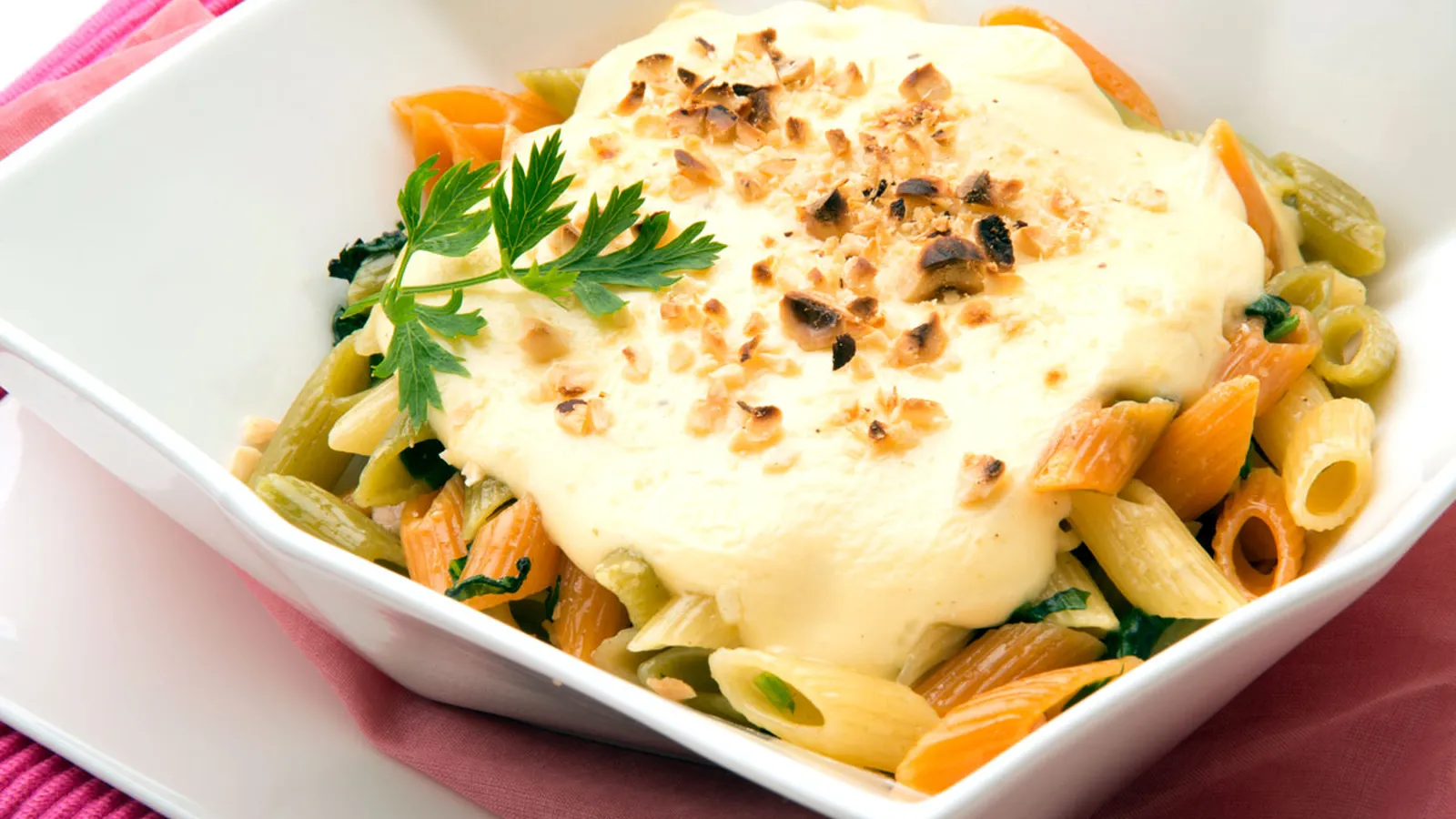 Receta de Karlos Arguiñano de macarrones con bacon y espinacas salteadas y cubiertos con salsa mornay gratinada y avellanas picadas.
