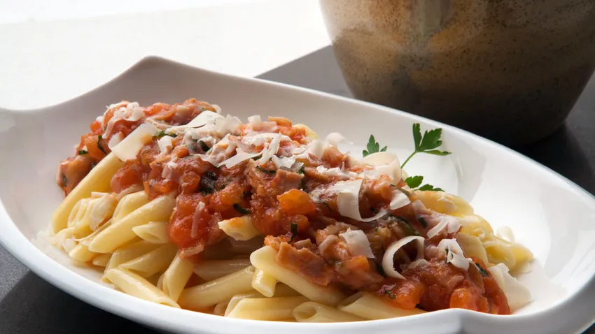 Receta de Karlos Arguiñano de macarrones deliciosos, un plato sencillo de pasta con bacon, salsa de tomate, albahaca picada y queso rallado.