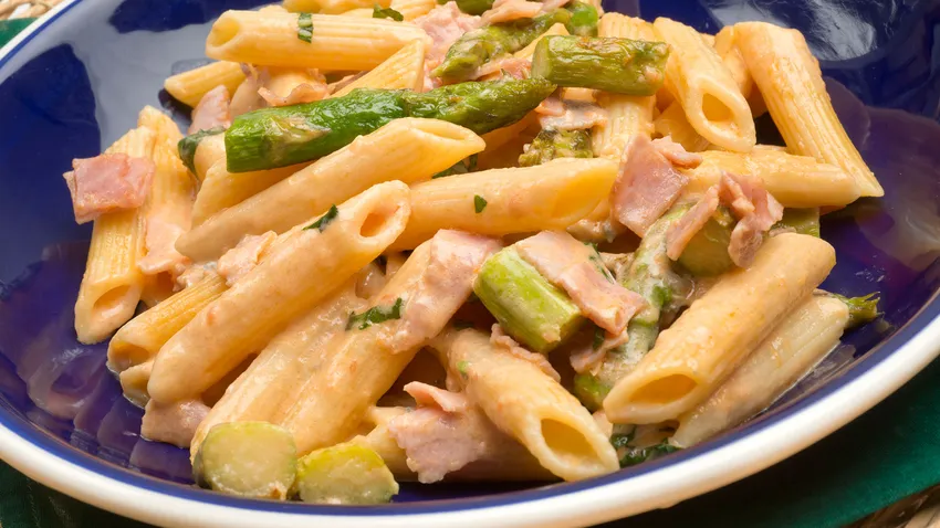 Macarrones con espárragos verdes y jamón