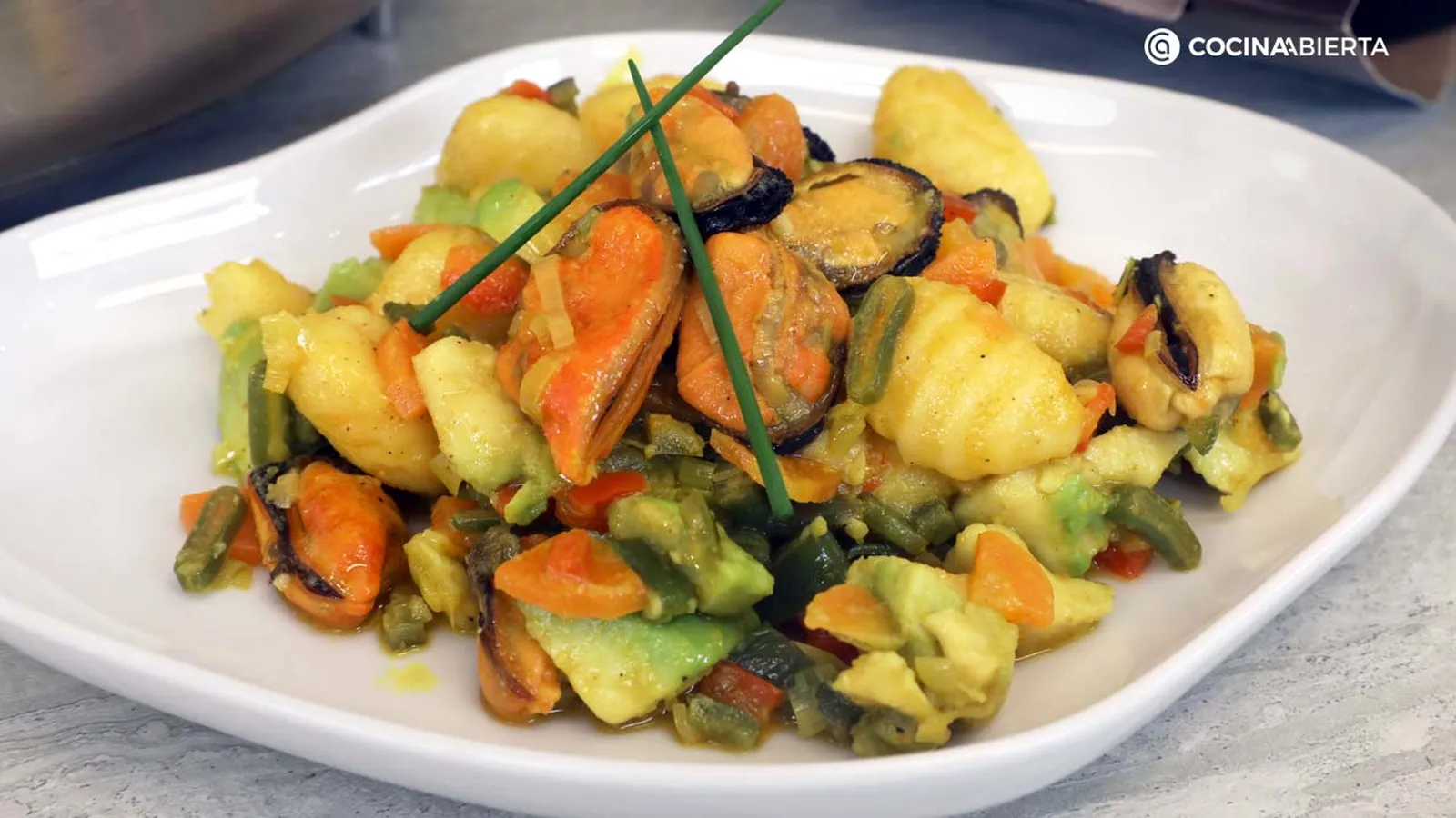Presentación de la receta Ñoquis con salteado de verduras y mejillones en Cocina Abierta: