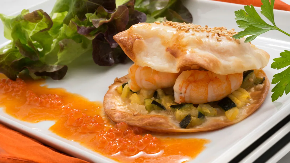 Karlos Arguiñano nos muestra cómo preparar una receta fácil de obleas para empanadillas al horno rellenas de calabacín y langostinos.