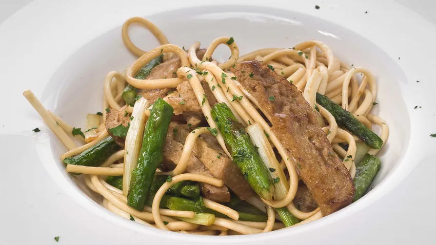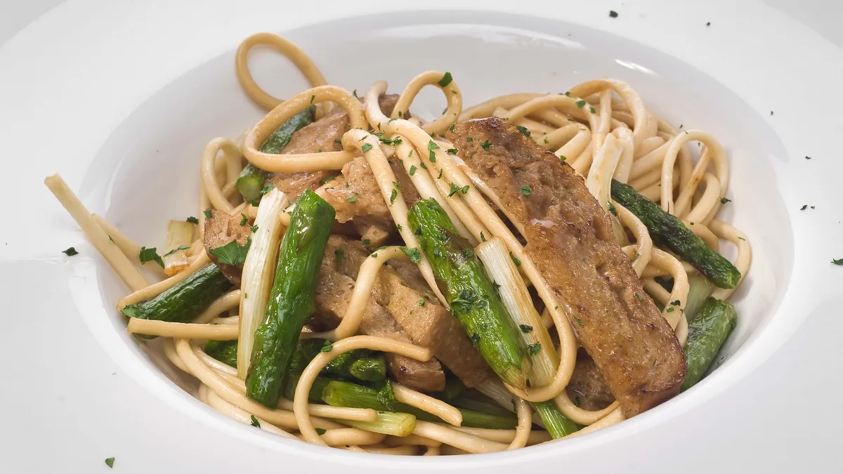 Receta de pasta china con seitan. Eva Arguiñano prepara un plato ideal para los vegetarianos con espárragos, ajetes y condimentos asiáticos.
