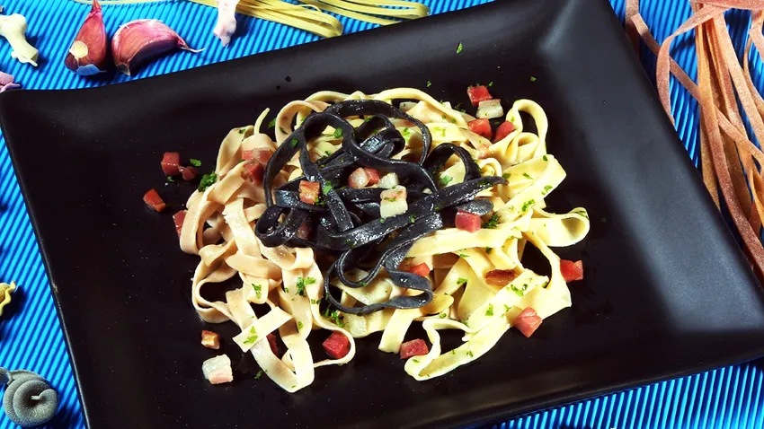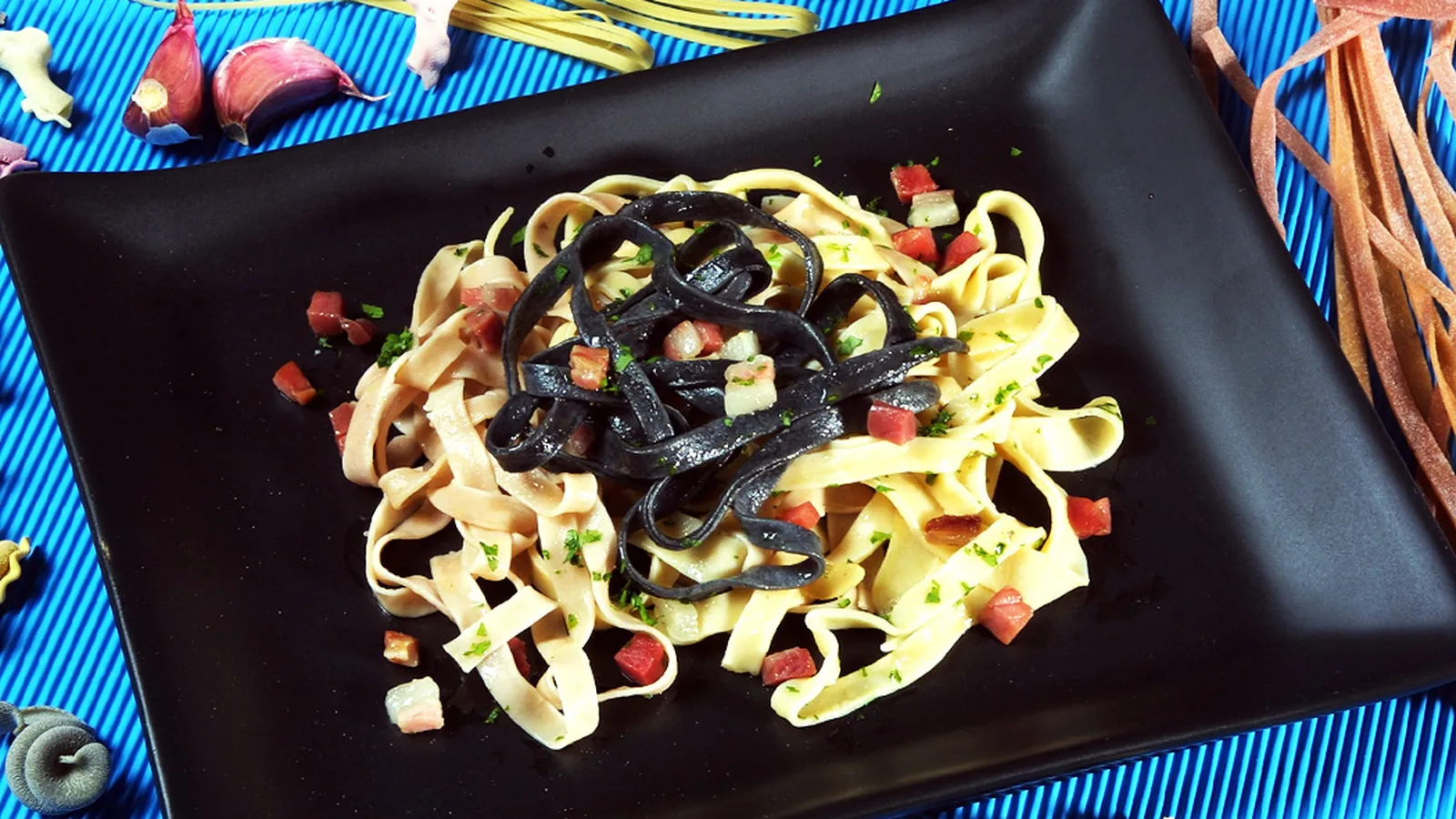 Hacer pasta de diferentes sabores y colores es muy sencillo. Si queréis una pasta roja, añadid un poco de puré de remolacha a la masa, si la queréis verde, un poco de puré de espinacas y si la queréis negra, un sobre de tinta de calamar.