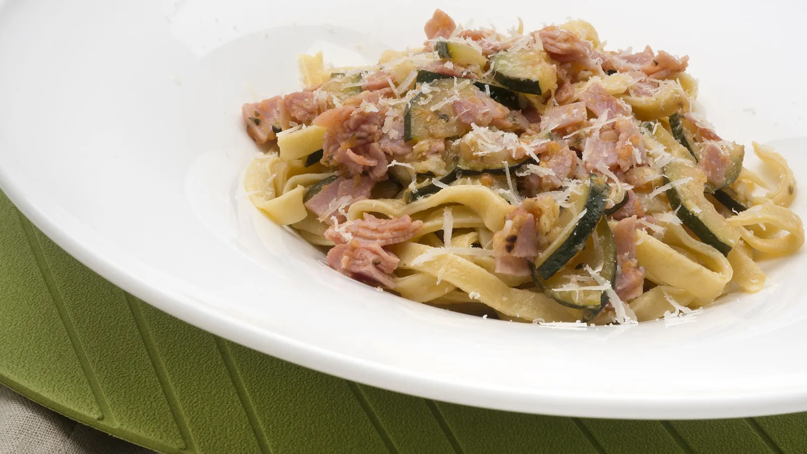 Pasta fresca con jamón, calabacín y queso