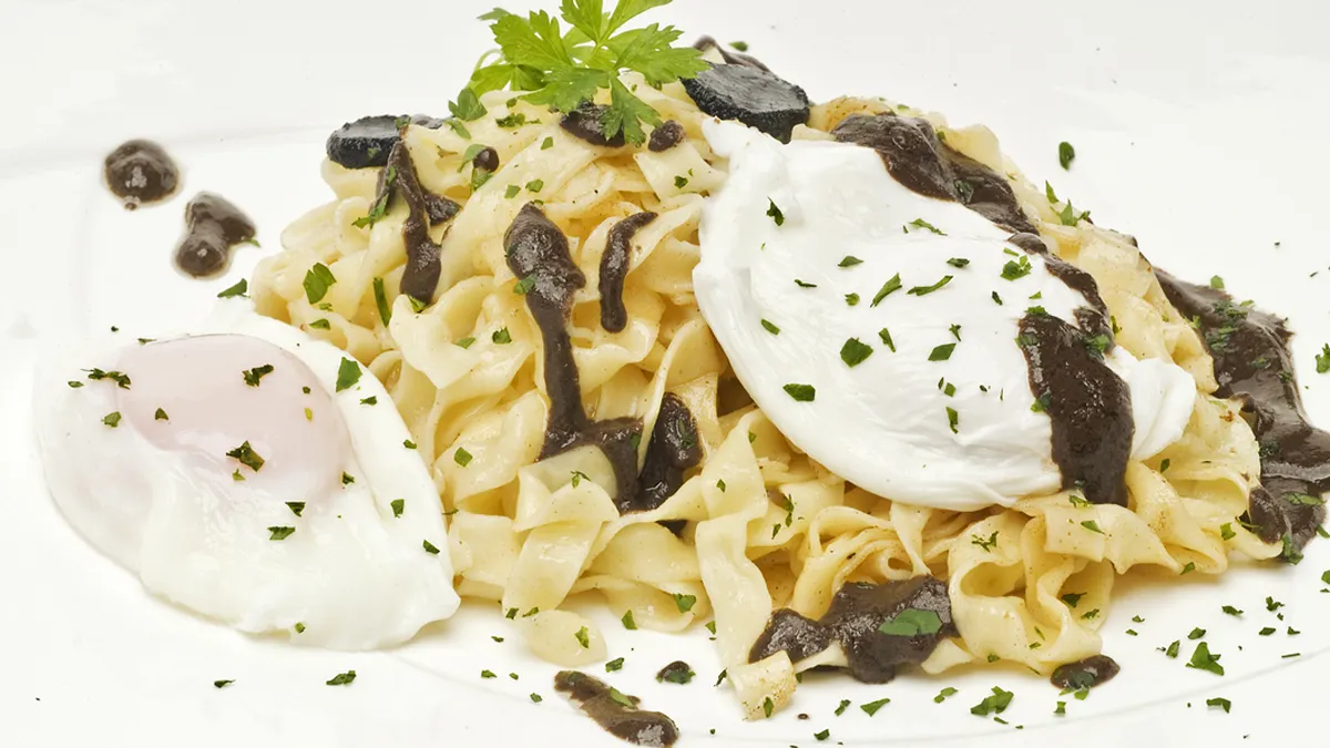 Pasta fresca con salsa de morcilla y huevo escalfado