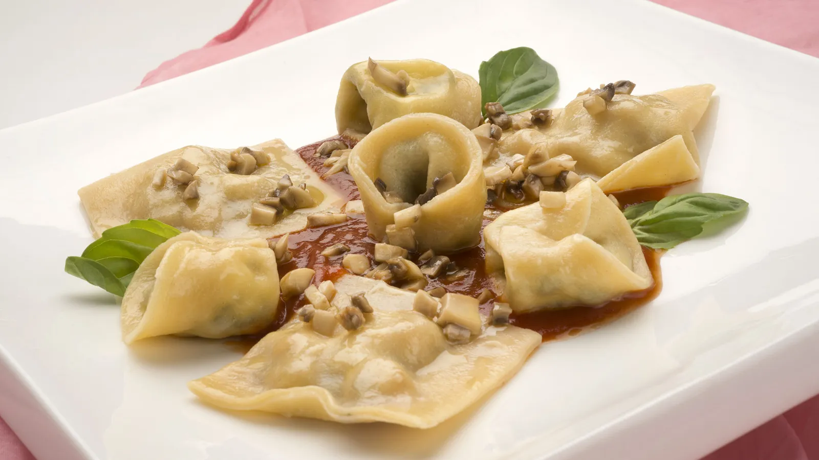 Sirve la pasta fresca rellena con los champiñones salteados y la salsa de tomate especiada. Decora con albahaca fresca y un chorrito de aceite.