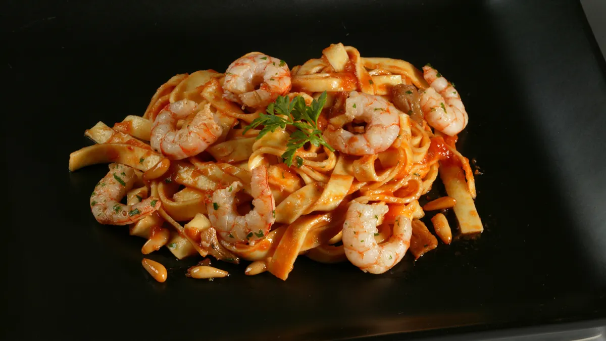 Pasta con gambas y piñones
