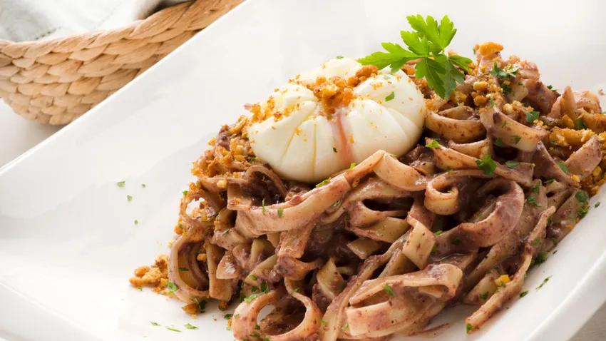 Pasta con morcilla, salsa de maíz y huevo escalfado