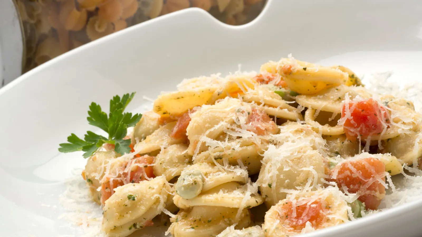 Pon un chorrito de aceite en el wok, agrega la pasta, las habitas, los tomates y el pesto. Saltea brevemente todo en el wok, sirve y ralla encima el queso. Añade un poco de pimienta y adorna con unas hojas de perejil.