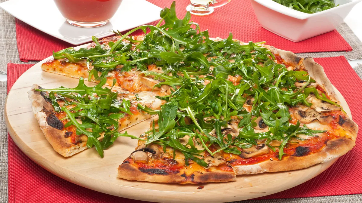 Pizza de champiñones con rúcula