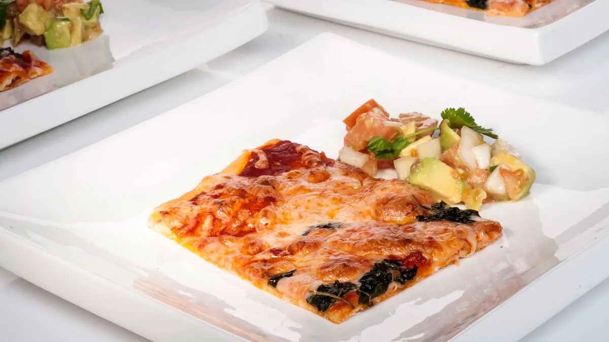 Corta la pizza en trozos, sirve en un plato y acompaña con la ensalada.