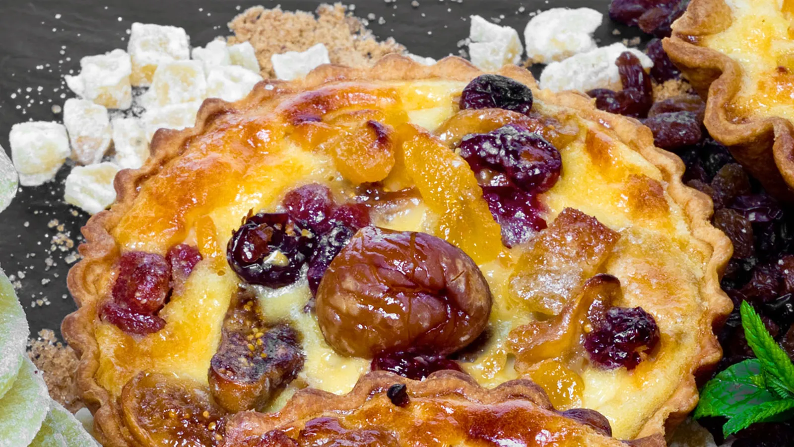 Rellena tres quiches con la mezcla salada y las otras tres quiches con la mezcla dulce. Sazona con una pizca de azúcar las quiches dulces y agrega en cada una, una castaña en almíbar. Introduce en el horno (precalentado) a 180ºC, durante 15-20 minutos. Retira del horno, desmolda y coloca las quiches en una fuente amplia. Puedes decorar con la selección de frutas escarchadas y unas bolitas de azúcar plateadas.