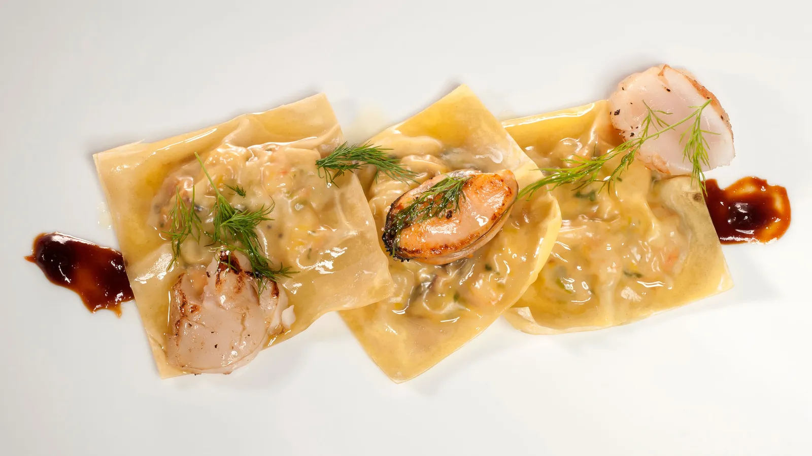 Bruno Oteiza elabora unos raviolis con pasta wonton rellenos de bechamel de marisco y verduras y acompañados de vieiras y mejillones salteados.