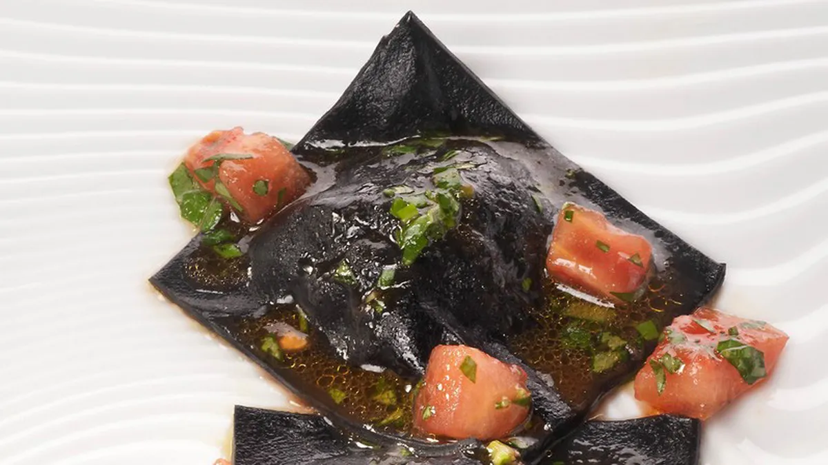 Receta de raviolis negros, un plato de pasta con tinta de calamar rellena de champiñones, foie y calabacín, inspirado de la cocina italiana y propuesto por Bruno Oteiza.