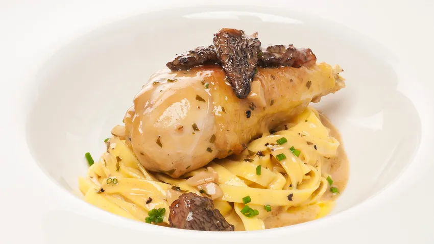 Receta de pasta, tagliatelle con setas morillas y pollo en vino dulce.