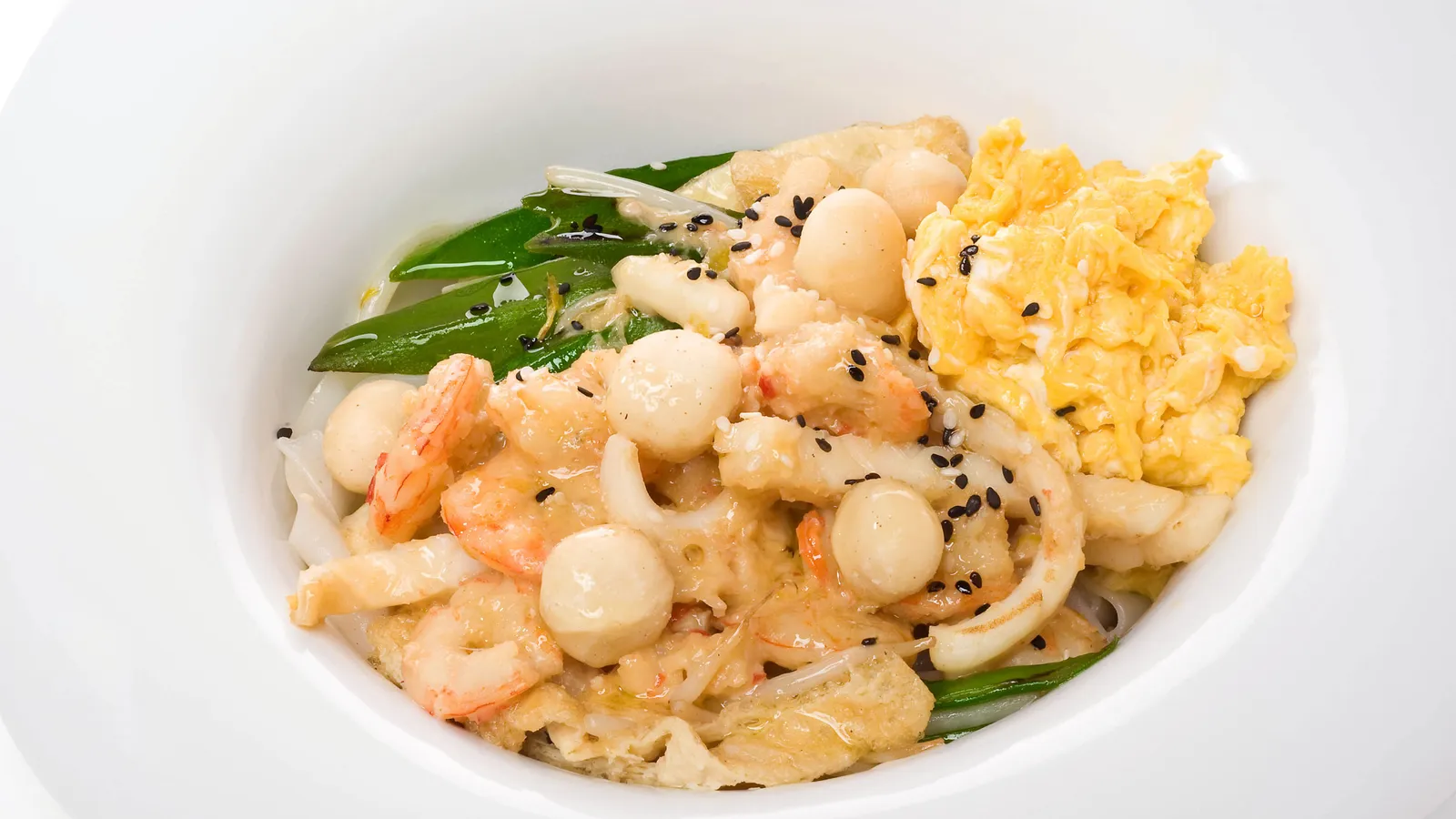Sirve los tallarines de arroz con el marisco y los vegetales. Acompaña con el revuelto y decora con las nueces de macadamia y unas semillas de sésamo.