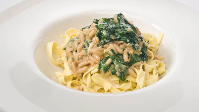 Deliciosa receta de tallarines con espinacas y queso azul, Karlos Arguiñano prepara un plato con una salsa de espinacas, crème fraiche, queso azul, piñones y chalotes.