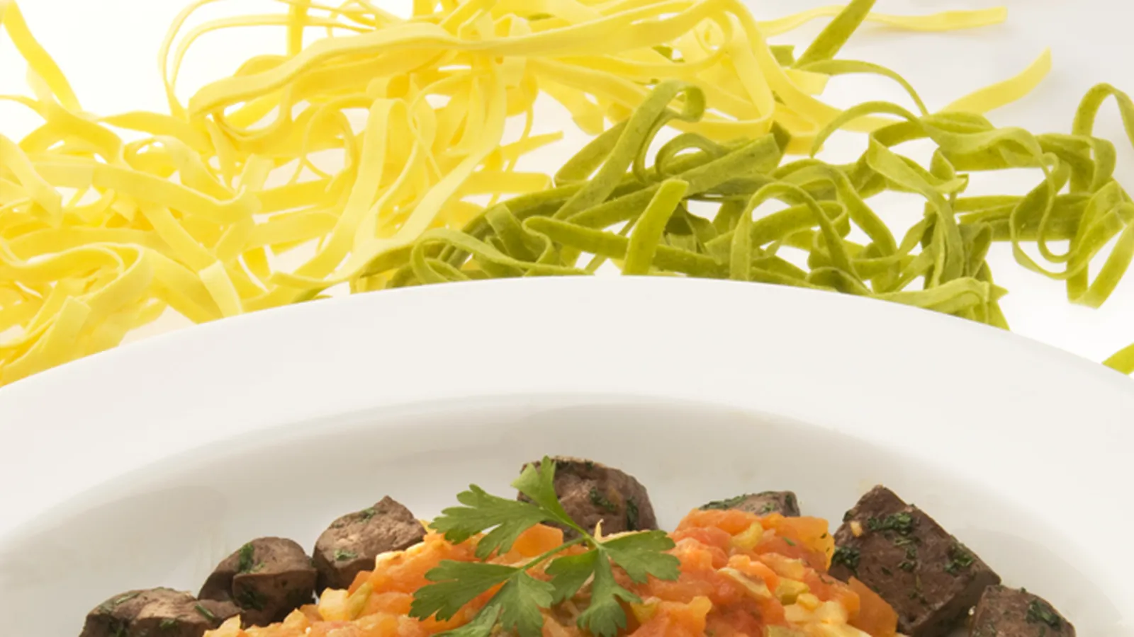 Receta de tallarines con hígado de ternera acompañada de una deliciosa salsa de tomate, pimiento verde, ajo y sazonada con comino. Receta de Karlos Arguiñano.