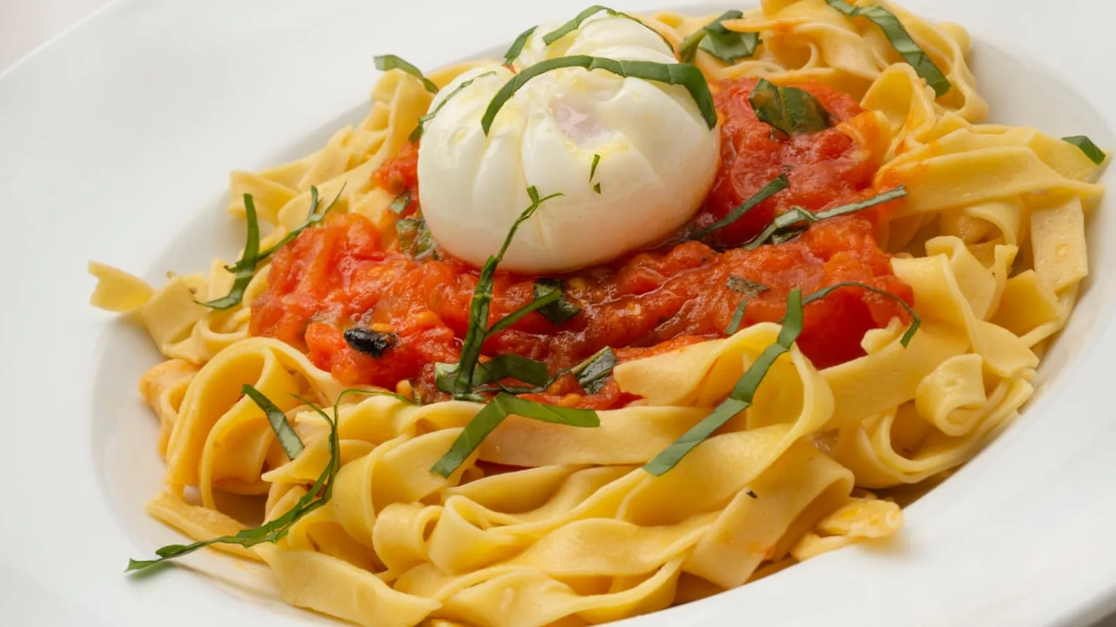 Retira, repártelos en 4 platos y rállales encima un poco de pimienta. Vierte un poco de salsa de tomate en cada plato y coloca un huevo encima de cada uno. Pica las hojas de albahaca finamente y espolvorea los platos.