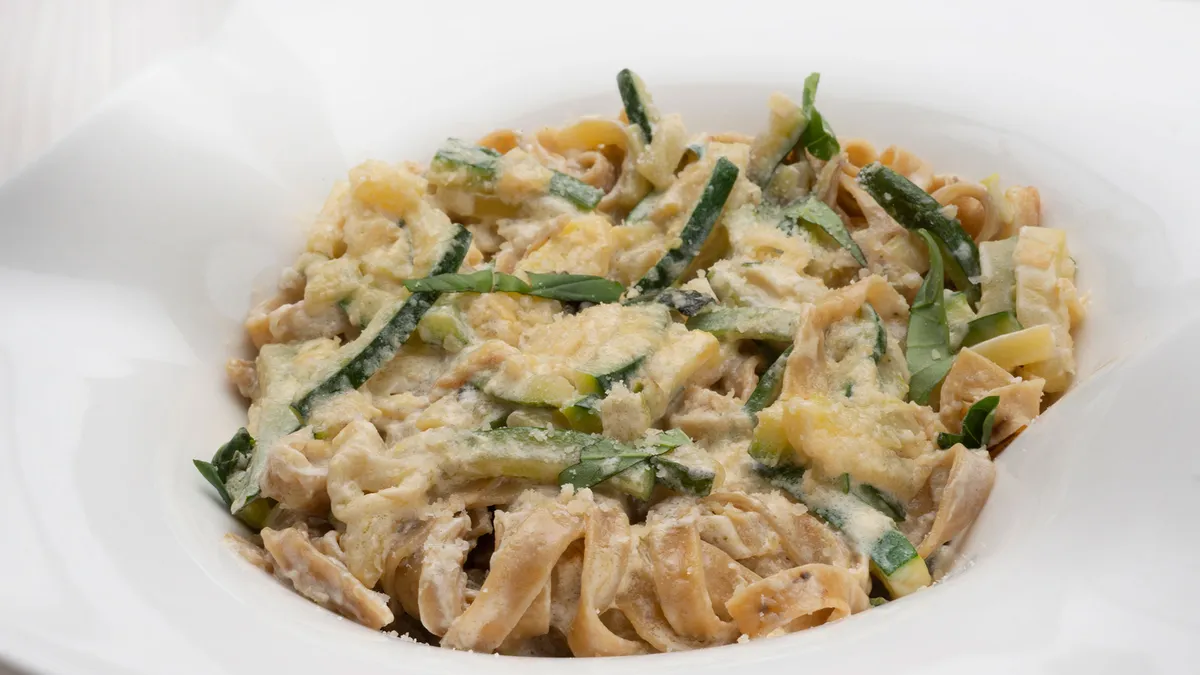 Pica los ajos frescos y la cebolleta finamente. Pon todo a pochar en una tartera con un poco de aceite. Lava el calabacín, córtalo en juliana e incorpóralo. Rehoga un poco y sazona. Añade la nata, la leche y mezcla bien. Cocina todo junto durante 5 minutos y reserva caliente.