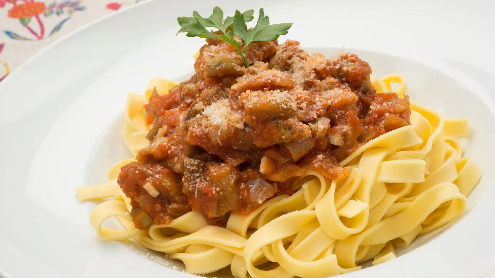 Tallarines con tomate, berenjena y tocineta