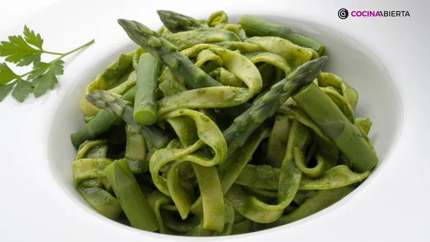 Estamos ante un plato de pasta tagliatelle o tallarines que acompañamos de una salsa verde elaborada con espinacas, albahaca y acompañado de espárragos verdes.