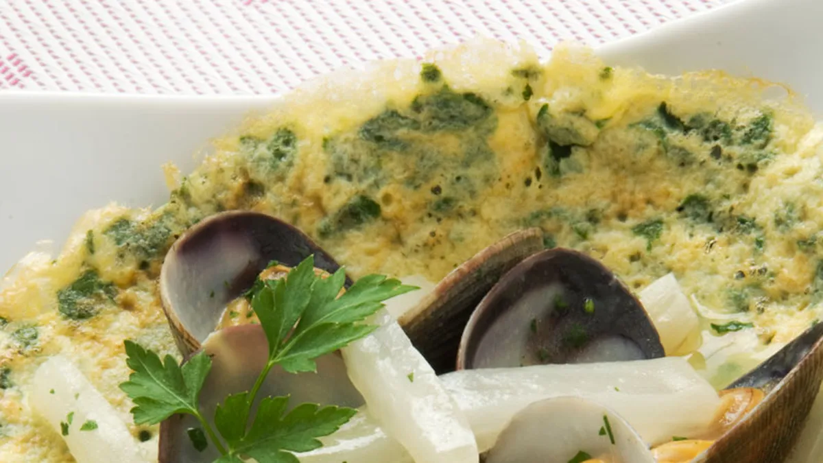 Para la salsa, pela y pica los ajos y rehógalos en una tartera con aceite. Cuando cojan color, añade la harina, cocínala un poco y vierte el agua y el vino blanco. Incorpora perejil picado e introduce las almejas y los bastones de penca. Coloca la tapa y deja cocinar 2-3 minutos hasta que se abran las almejas. Reserva.