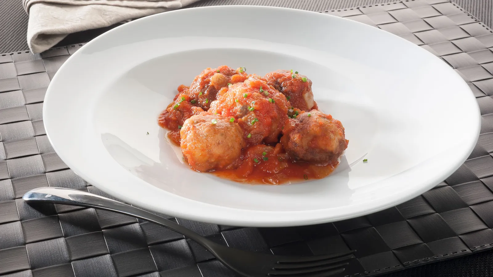 Coloca una ración de albóndigas de atún y salsa de tomate en un plato. Espolvorea con cebollino fresco picado. Sirve.