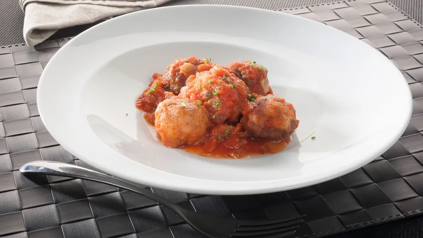 Haz albóndigas con la mezcla. Enharínalas y fríelas en aceite de oliva hasta que queden doradas por fuera. Incorpóralas a la salsa de tomate. Tapa la cazuela y cocínalas durante 5-10 minutos.