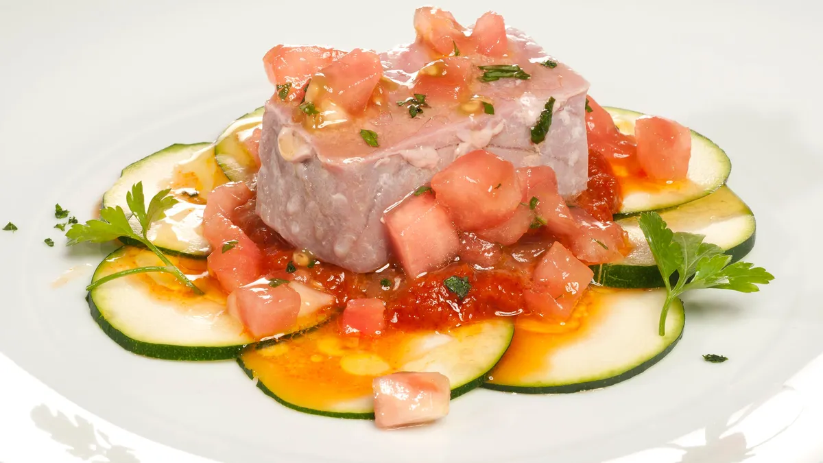 Bruno Oteiza prepara el clásico atún con tomate de una forma más veraniega: atún al vapor con cebolla pochada, salsa de tomate, calabacín y vinagreta de tomate fresco con albahaca.