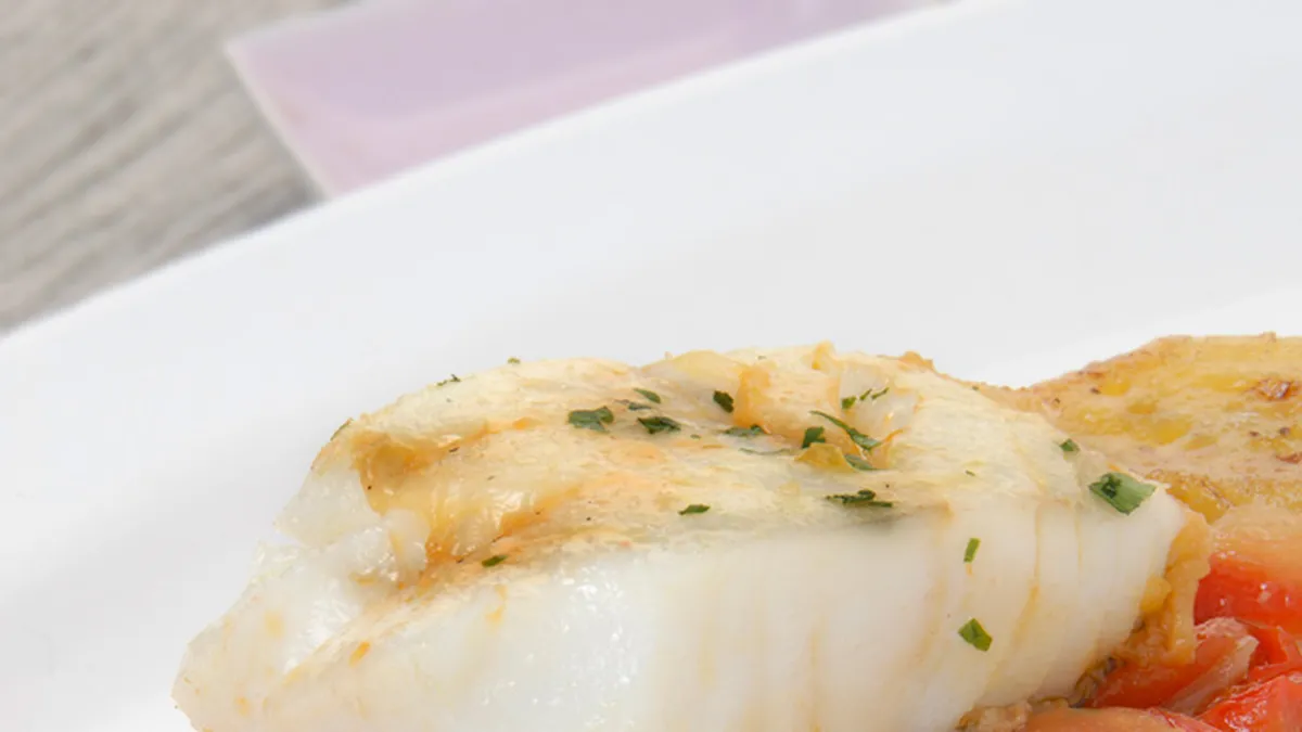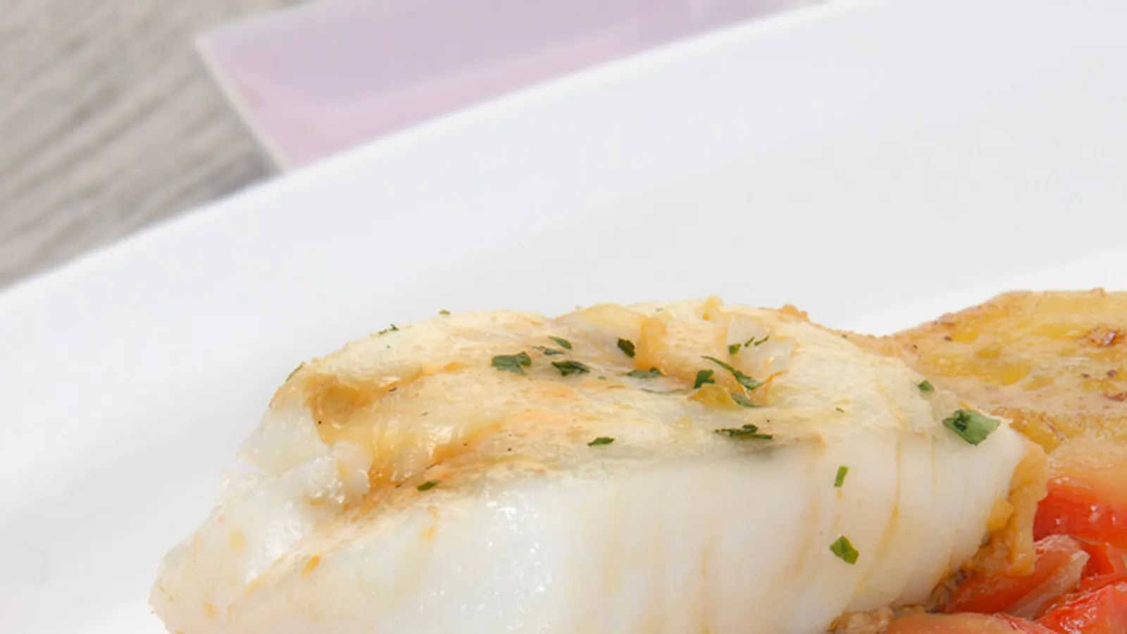 La receta de bacalao con aire canario es una receta en la que se acompaña el bacalao con una base de rodajas de plátano frito y verdura pochada.