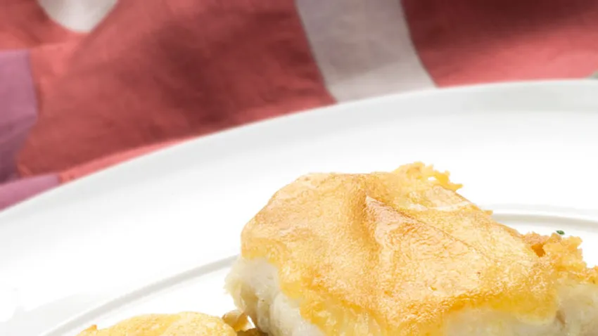 Receta de lomos de bacalao en salazón con cebolla cocinada a fuego lento y gratinados con mahonesa de ajo.