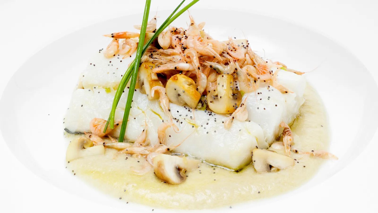 Sirve en plato sopero el pil-pil de champiñones, el bacalao y los champiñones salteados. Decora el plato con unas semillas de amapola y unos cebollinos. Si quieres, puedes acompañar con unos camarones cocidos.