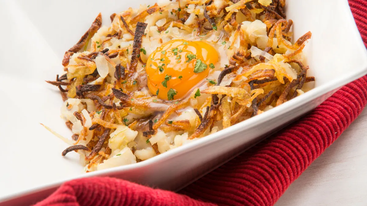 Receta de Karlos Arguiñano de Bacalao dorado a mi manera, un plato tradicional de la cocina portuguesa elaborado con bacalao, patatas paja, cebolleta y huevo gratinado en el horno.