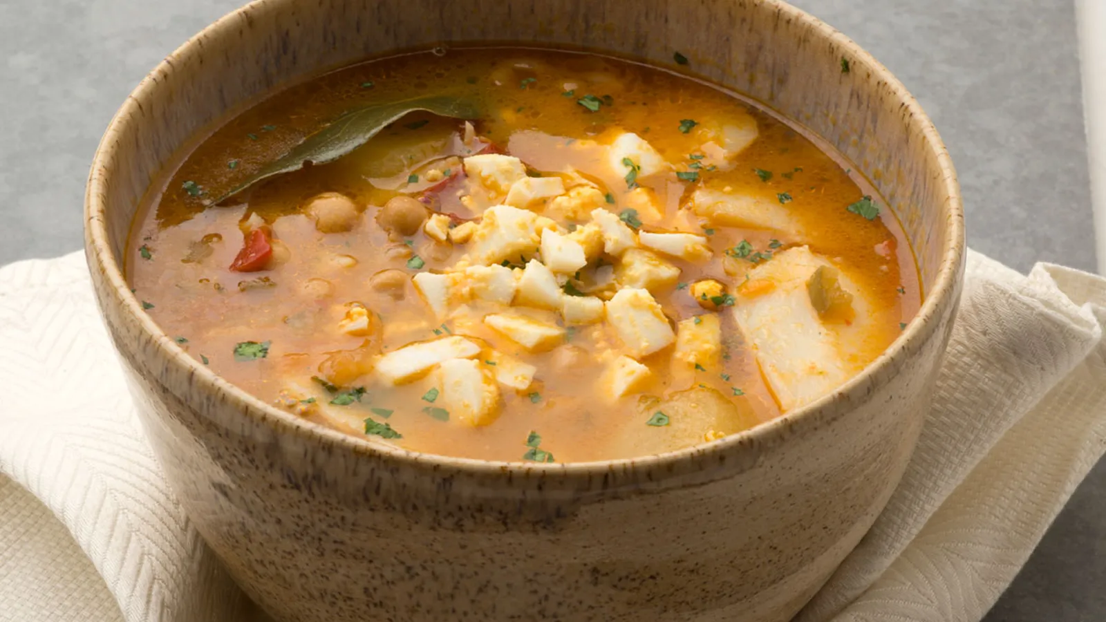 Receta de Karlos Arguiñano de guiso de bacalao con garbanzos, patata, huevo cocido, fideos, cebolleta, pimiento y tomate, un plato saludable y sencillo de preparar.
