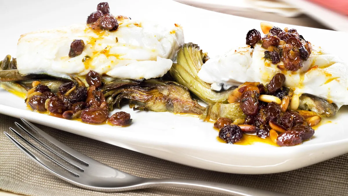 Receta de bacalao frito con alcachofas y una salsa de miel y frutos secos elaborada por Eva Arguiñano en Hoy cocinas tú.
