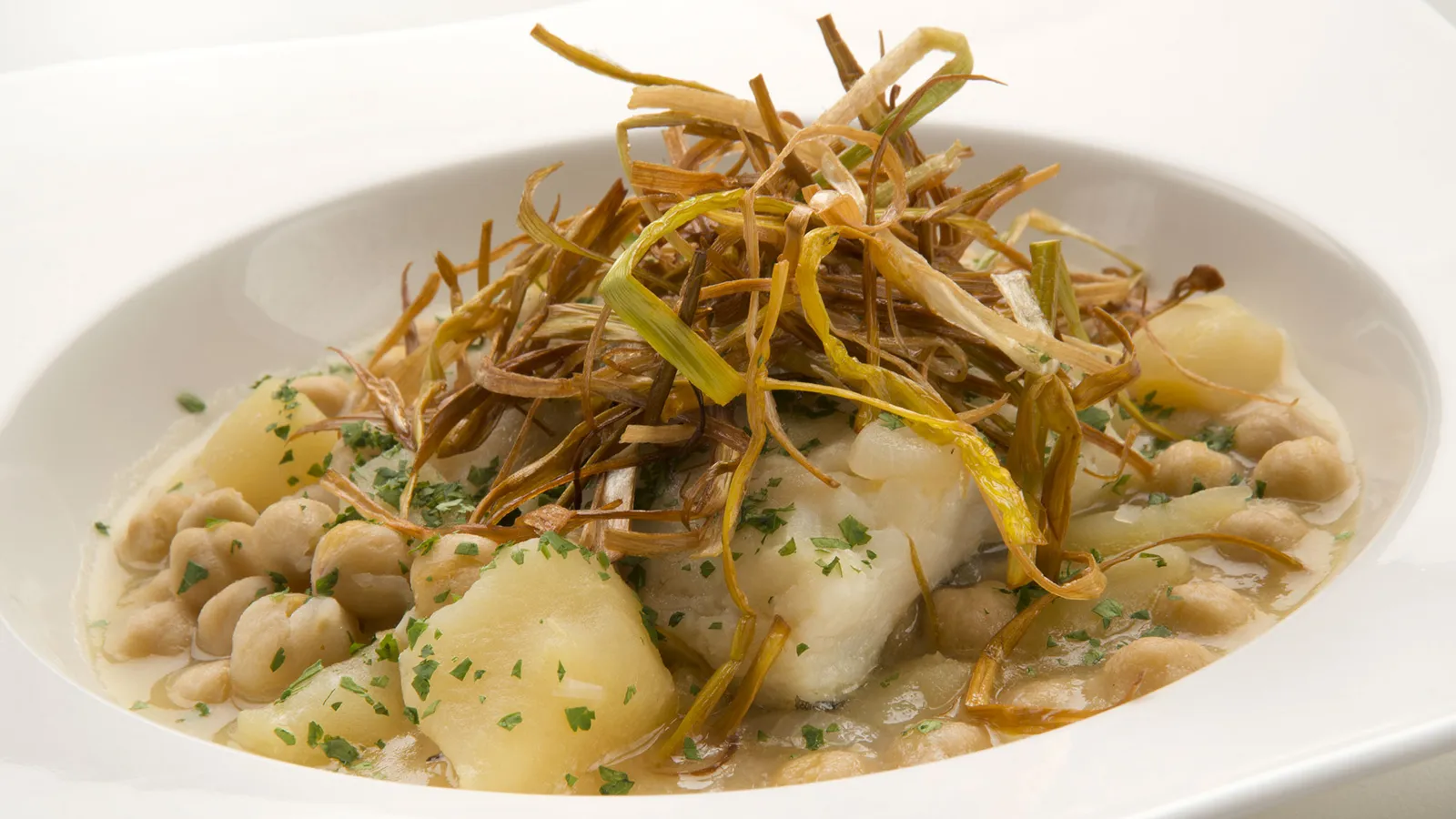 Karlos Arguiñano prepara un plato de bacalao con patatas y garbanzos cocinados en la olla rápida y lo decora con tiras de puerro frito.