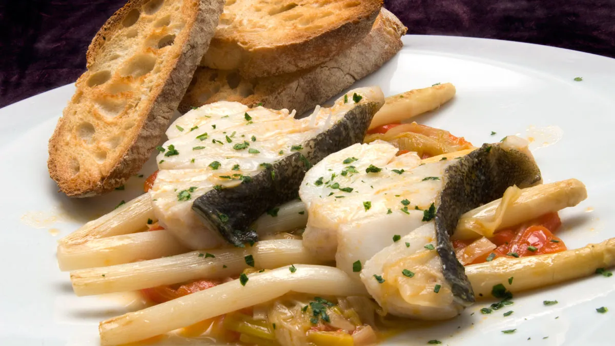Corta el pan en rebanadas y tuéstalas en el horno hasta que se doren (con el gratinador). A la hora de emplatar, pon una cama de verduras y coloca encima los trozos de bacalao. Acompaña con los espárragos y con las rebanadas de pan tostado. Espolvorea con perejil picado.