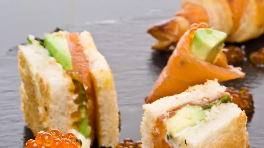 Aperitivos variados de rollitos de salmón ahumado rellenos de aguacate, tostadas con queso de untar y huevas de trucha y hojaldre relleno de queso y salmón ahumado.