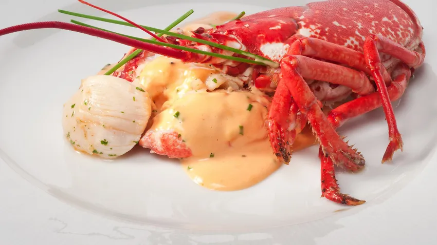 Receta de bogavante cocido con vieiras salteadas y una salsa de vino blanco.