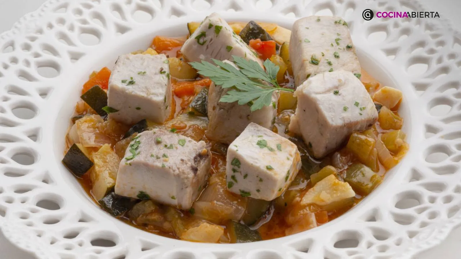 Retira la cayena, reparte el pisto en 4 platos y coloca los dados de bonito encima. Decora los platos con unas hojas de perejil.