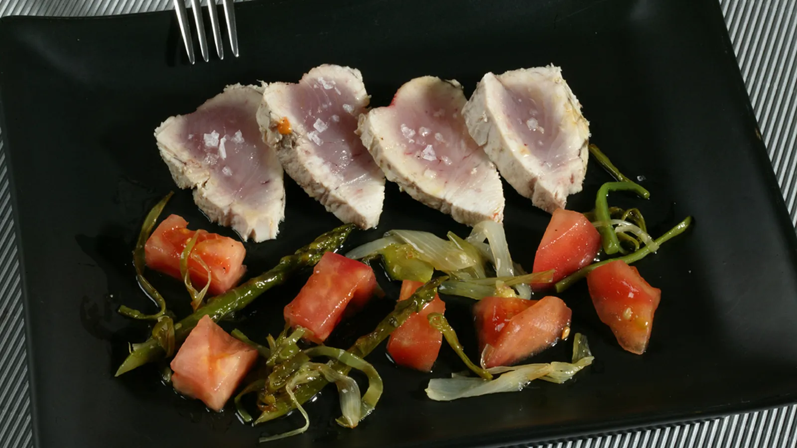 Sirve las verduras en una fuente, coloca encima los medallones de bonito, y el tomate macerado. Riega todo con un poco de aceite y sazona el pescado con sal gruesa.