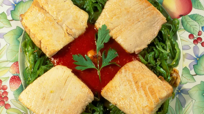 Receta de Karlos Arguiñano de bonito con pimiento verde y salsa de tomate.