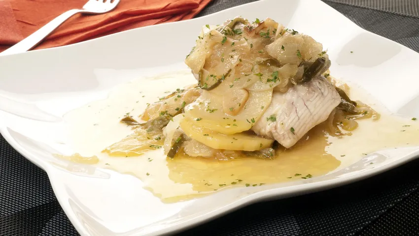 Bruno Oteiza nos deleita con un delicioso plato de bonito a la sidra acompañado de verduras.