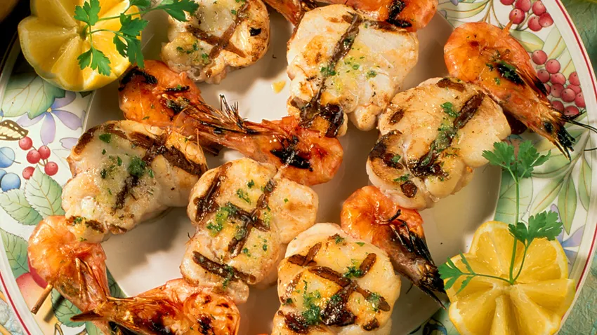 Brochetas de rape y langostinos a la parrilla